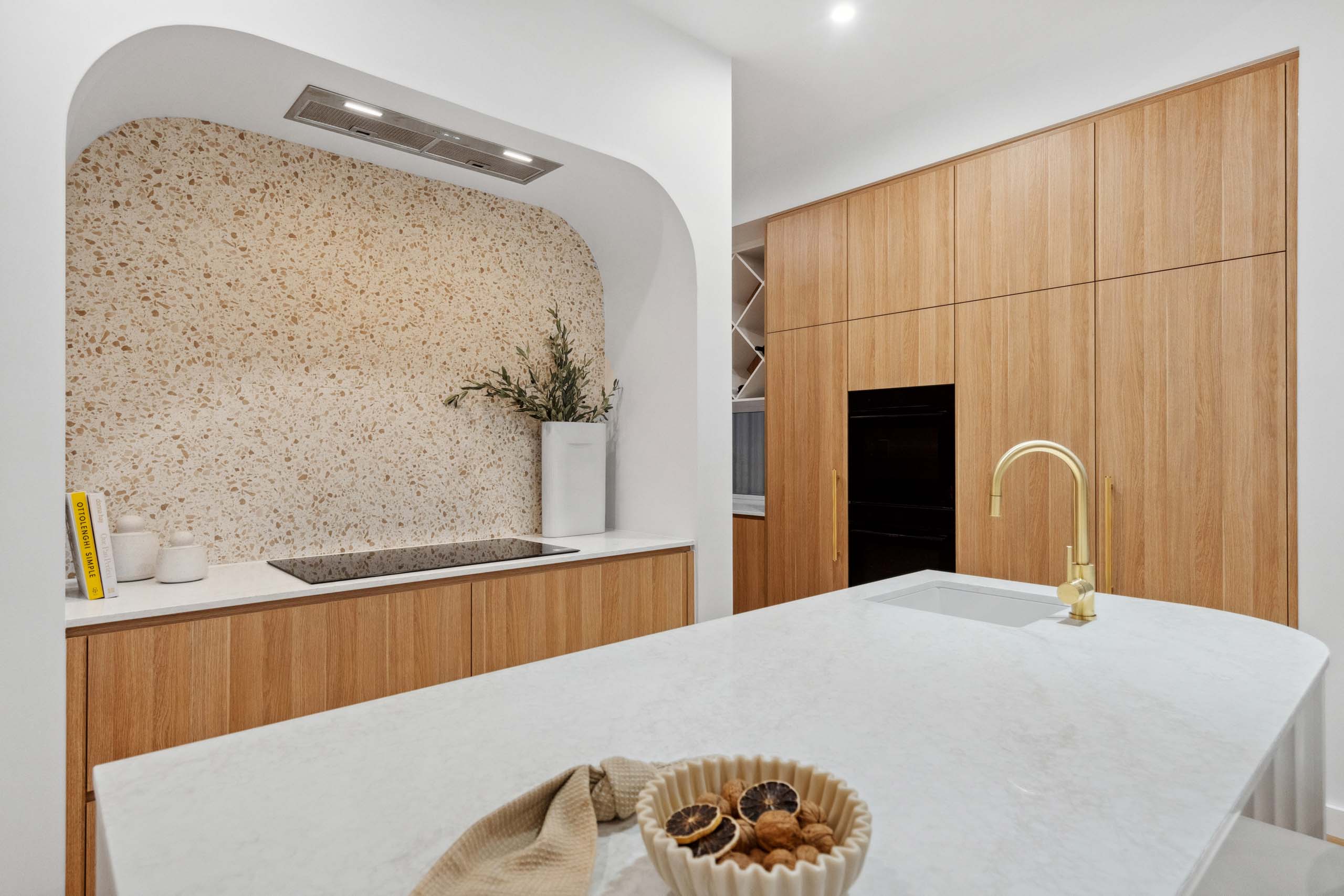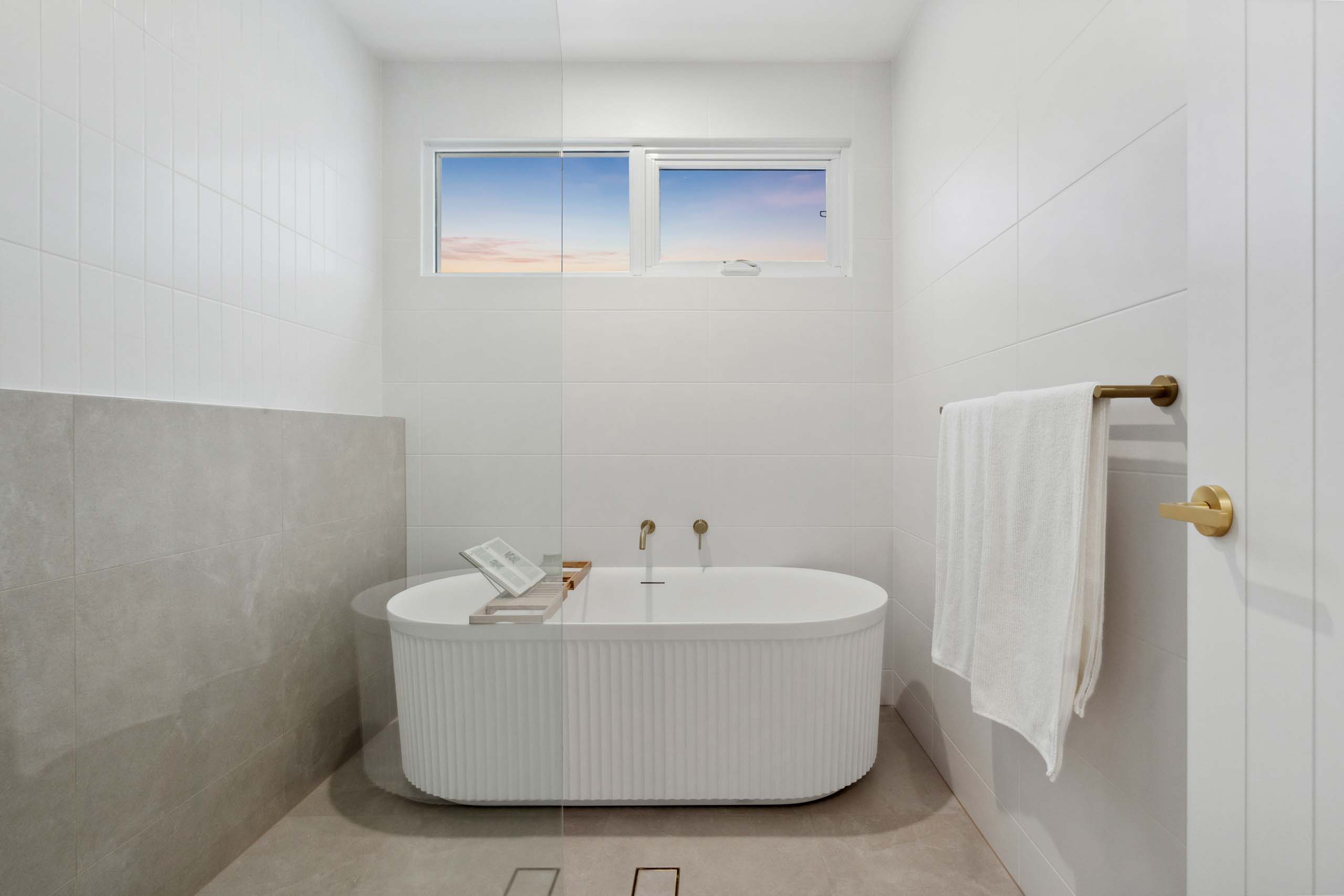 At the heart, a fluted white island anchors a curved terrazzo cook niche, with warm timber cabinetry, integrated appliances and brass tapware. A full butler’s pantry and a finely detailed laundry keep prep out of sight. The floor plan reflects coastal beach house designs: light‑filled living flowing to a covered alfresco with built‑in BBQ and sink, travertine‑style paving and a glass‑fenced lap pool. Upstairs, a family retreat sits alongside airy bedrooms; the main suite enjoys wall‑to‑wall glazing, while bathrooms pair a ribbed freestanding bath, stone mosaics and walk‑in showers.